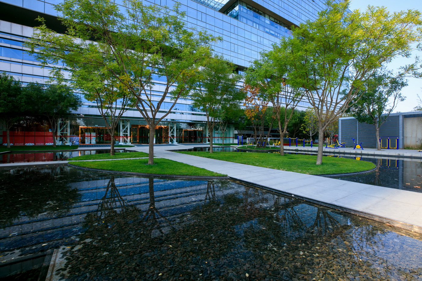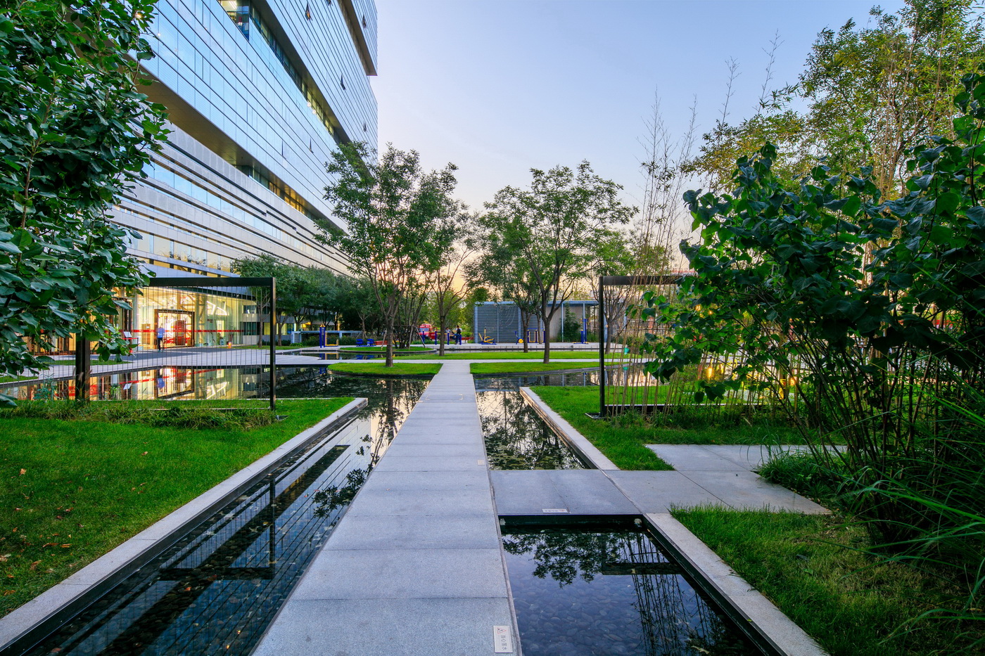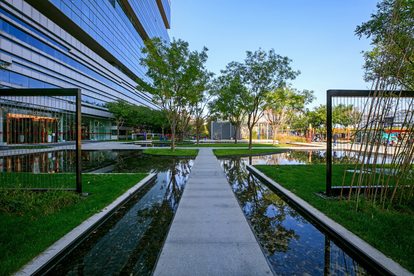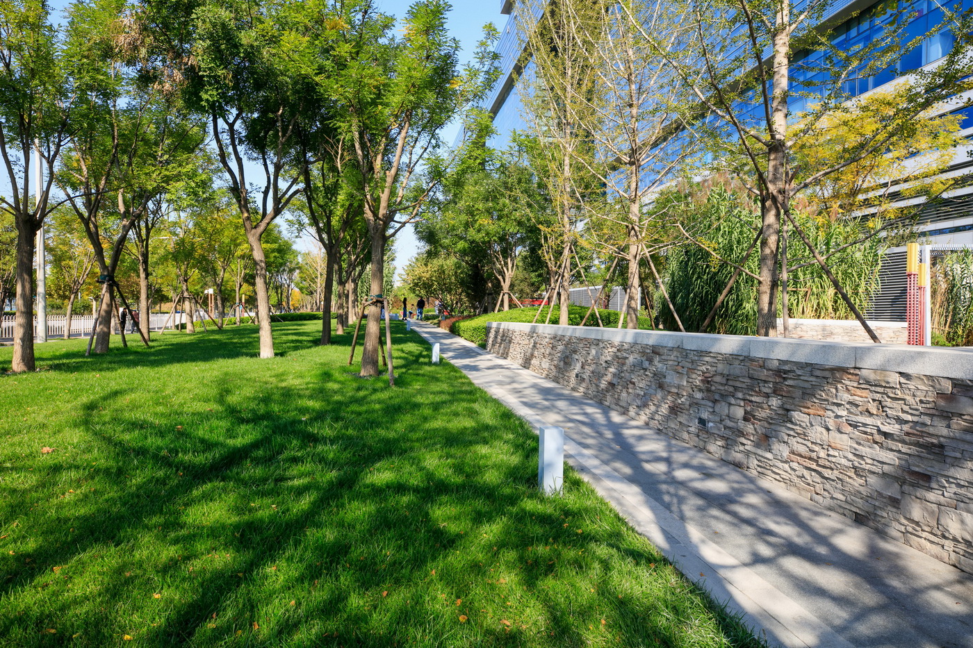 北京京東集團總部為京東集團總部辦公樓,項目應(yīng)用野草、整石等營造野趣又簡約大氣的辦公空間。項目工程采用了新工藝—不銹鋼鋼絲影壁,其邊框為碳化拉絲不銹鋼。影壁施工中多次與設(shè)計甲方溝通,實地做樣板,為了更好的營造景觀,最后將原來的亞克力板改為不銹鋼鋼絲繩。以片植竹子為背景的影壁在陽光或燈光照射下效果極富意境。在辦公人員休息活動區(qū)域,具有項目特色的紅菠蘿格木椅,點綴飄逸的觀賞草,既是休息之處亦是觀賞之景,充滿意趣。