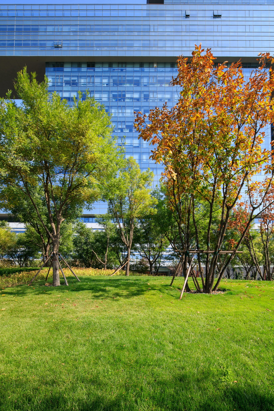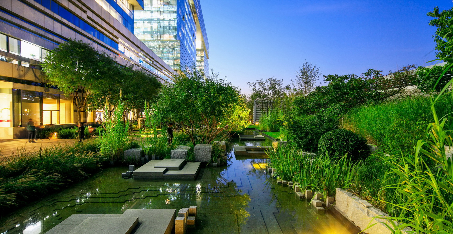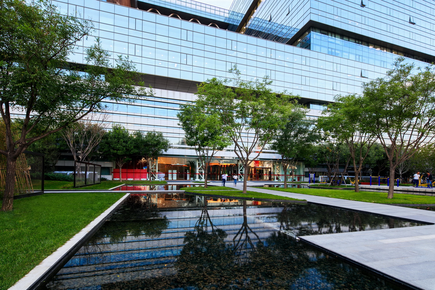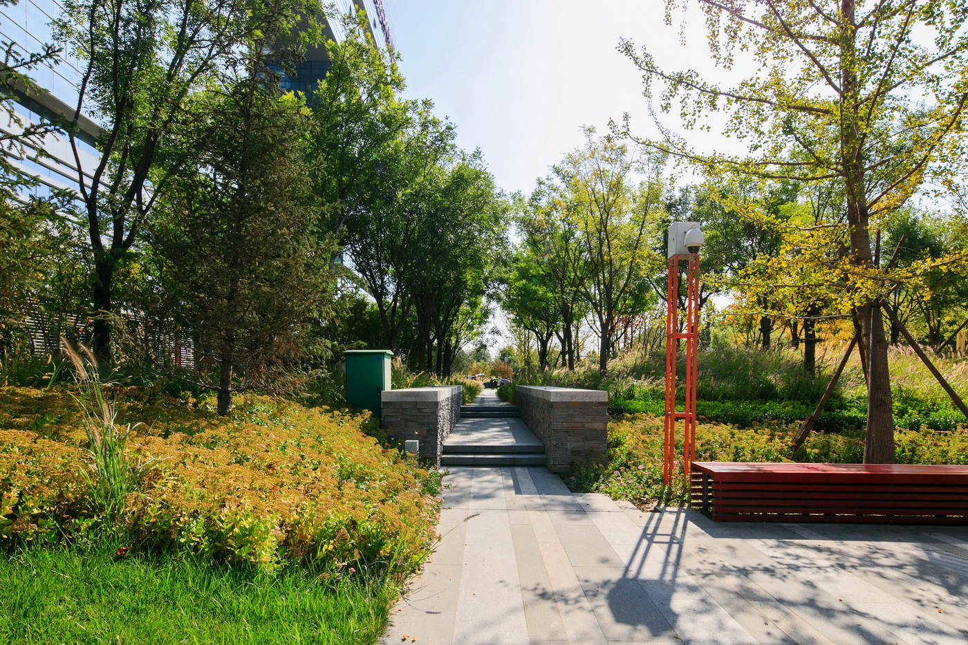北京京東集團總部為京東集團總部辦公樓,項目應(yīng)用野草、整石等營造野趣又簡約大氣的辦公空間。項目工程采用了新工藝—不銹鋼鋼絲影壁,其邊框為碳化拉絲不銹鋼。影壁施工中多次與設(shè)計甲方溝通,實地做樣板,為了更好的營造景觀,最后將原來的亞克力板改為不銹鋼鋼絲繩。以片植竹子為背景的影壁在陽光或燈光照射下效果極富意境。在辦公人員休息活動區(qū)域,具有項目特色的紅菠蘿格木椅,點綴飄逸的觀賞草,既是休息之處亦是觀賞之景,充滿意趣。