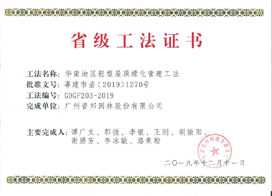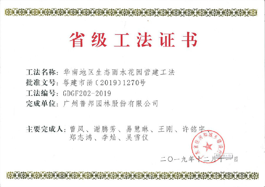 近日,我司收到廣東省住房和城鄉(xiāng)建設(shè)廳頒發(fā)的《華南地區(qū)生態(tài)雨水花園營(yíng)建工法》(GDGF202-2019)、《華南地區(qū)輕型屋頂綠化營(yíng)建工法》(GDGF203-2019)、《濱海土壤排鹽堿及景觀營(yíng)建施工工法》(GDGF204-2019),這是我司在海綿型綠地建設(shè)技術(shù)和濱海景觀生態(tài)修復(fù)實(shí)踐取得的重要成果。